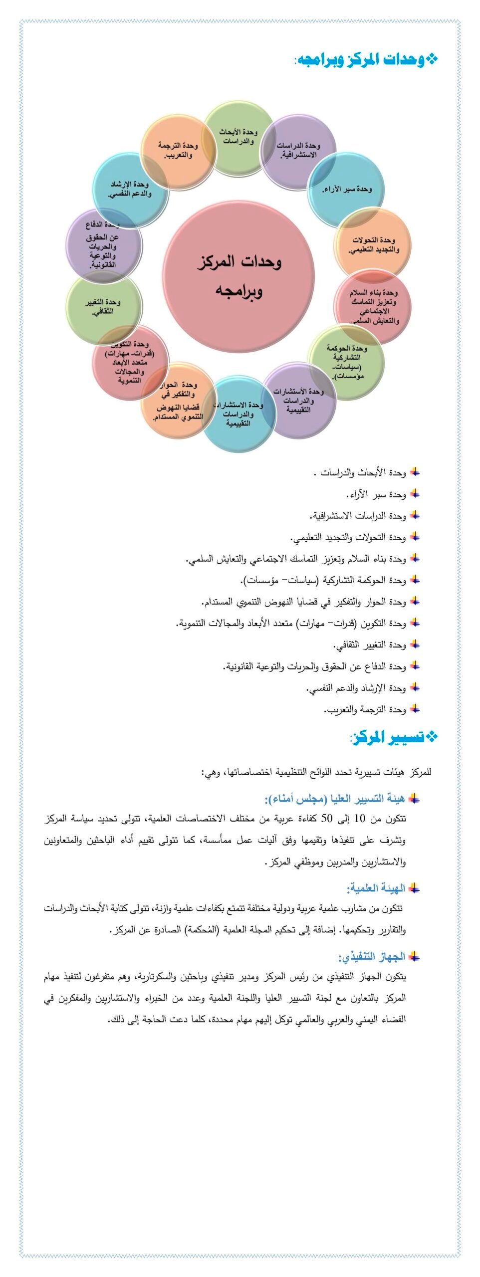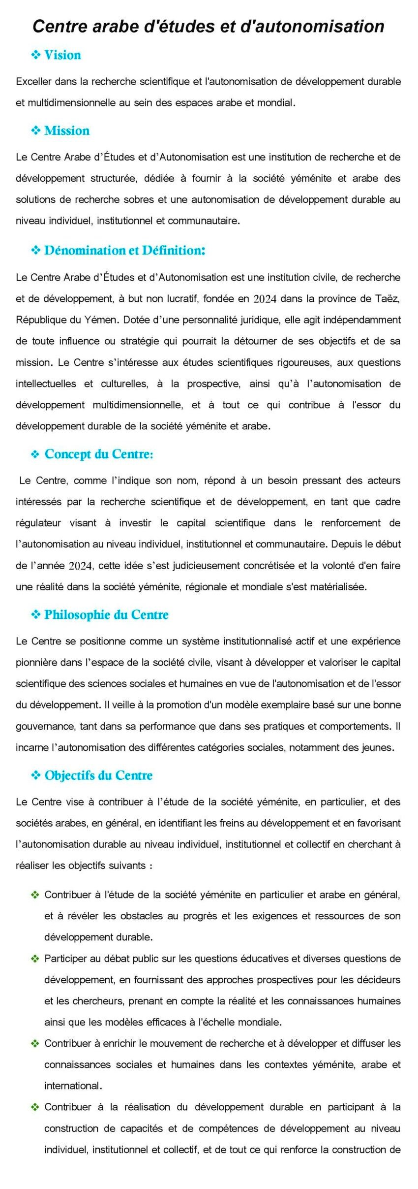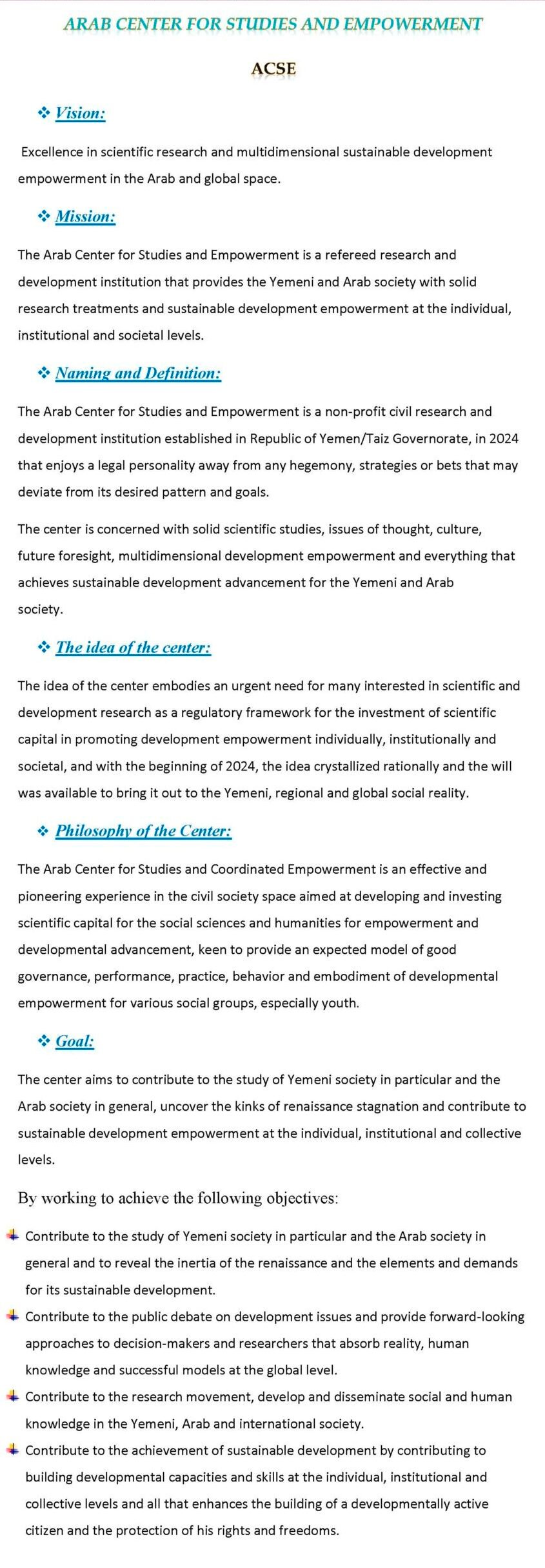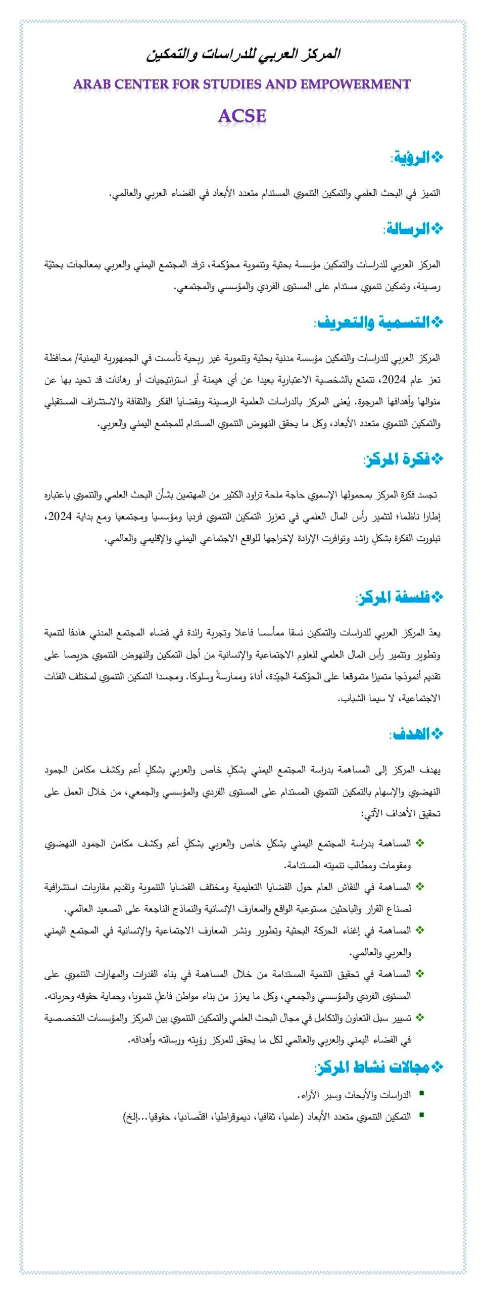 المركز العربي للدراسات والتمكين مؤسسة مدنية بحثية وتنموية غير ربحية تأسست في الجمهورية اليمنية/ محافظة تعز عام 2024، تتمتع بالشخصية الاعتبارية بعيدا عن أي هيمنة أو استراتيجيات أو رهانات قد تحيد بها عن منوالها وأهدافها المرجوة. يُعنى المركز بالدراسات العلمية الرصينة وبقضايا الفكر والثقافة والاستشراف المستقبلي والتمكين التنموي متعدد الأبعاد، وكل ما يحقق النهوض التنموي المستدام للمجتمع اليمني والعربي.